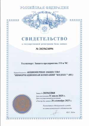 Свидетельство о государственной регистрации базы данных «Техэксперт: Промышленная безопасность»